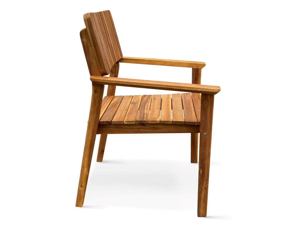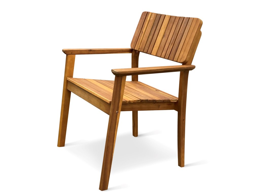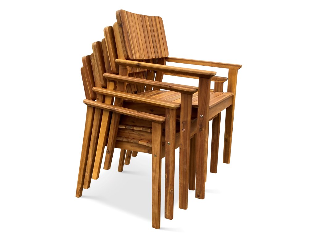 Balkonový stolek doplňují 2 křesla LUCY z akáciového dřeva. Zajímavý vzhled a kvalitní zpracování křesla. Zvolená poměrně robustní konstrukce křesla není v kategorii akáciového zahradního nábytku obvyklá. Křeslo je navíc velmi komfortní díky prostornému sedáku o rozměrech 46 x 48 cm a díky pevným dřevěným područkám. Křesla lze stohovat, což oceníte zejména při uskladnění po sezóně. Nosnost činí až 120 kg.