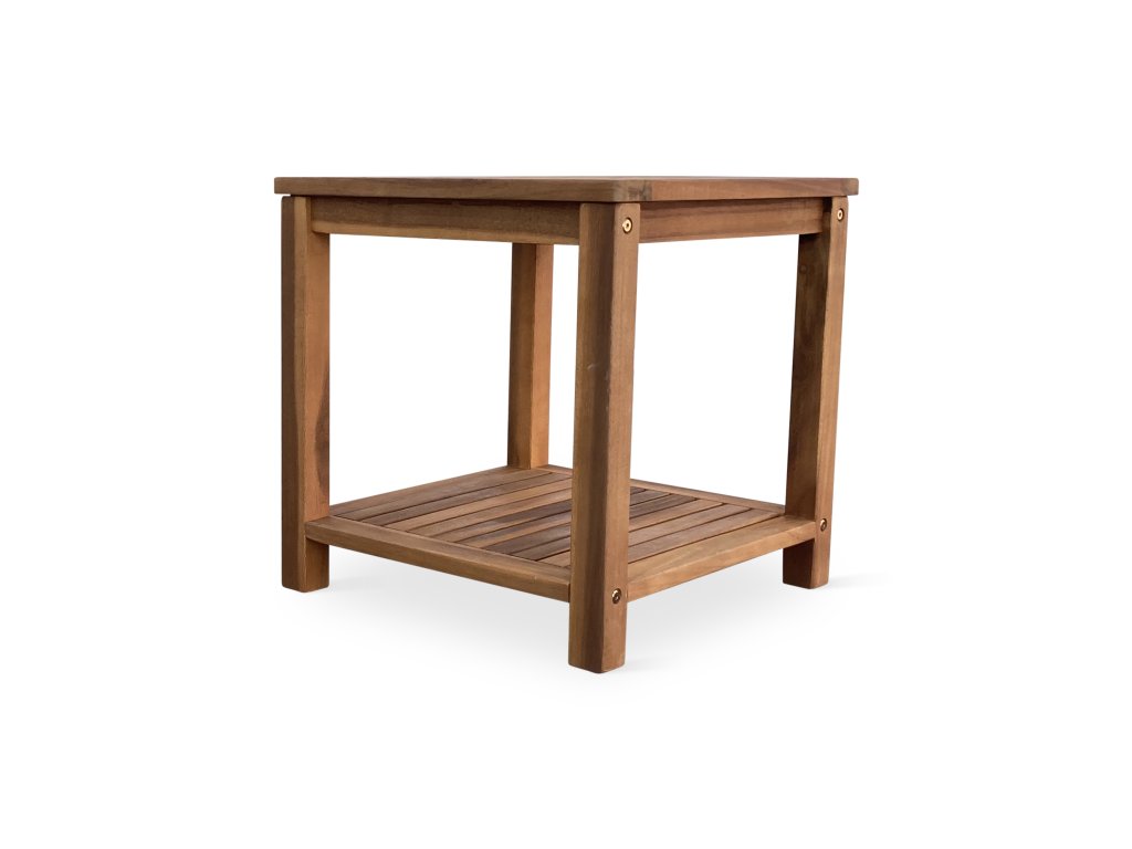 Čtvercový odkládací stolek LOTTO z akáciového dřeva vhodný například k lehátku nebo k zahradní židli. Lehký stolek snadno přenesete. Malá čtvercová deska o rozměru 45 x 45 cm společně s policí ve spodní části konstrukce bude ideální pro odložení občerstvení a dalších nezbytných drobností.