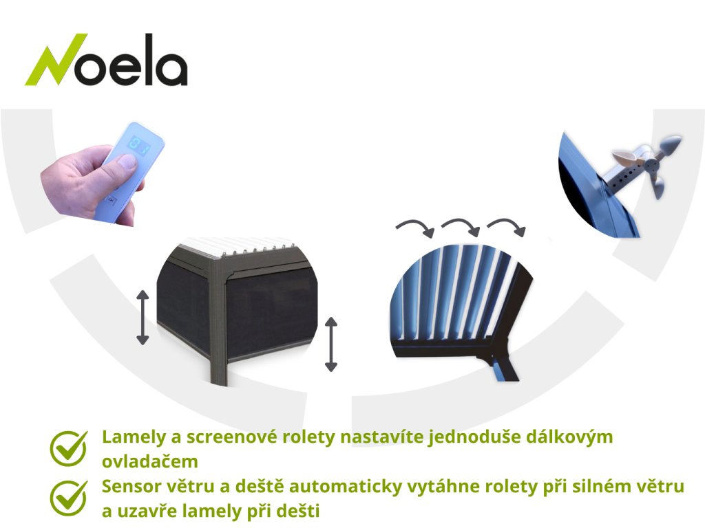 Pergola disponuje čtyřmi screenovými roletami po stranách. Stahování rolet stejně jako ostatní funkce pergoly lze ovládat pomocí dálkového ovladače, který je součástí balení. Naklápění 25 lamel na střeše pergoly a stažení screenových rolet zajistí zabudované elektromotory. Manipulace je tedy velmi jednoduchá a nenáročná. Součástí je i LED osvětlení namontované ve 4 lamelách, které rozsvítíte také pohodlně na dálku ovladačem. Použité materiály odolávají povětrnostním vlivům.