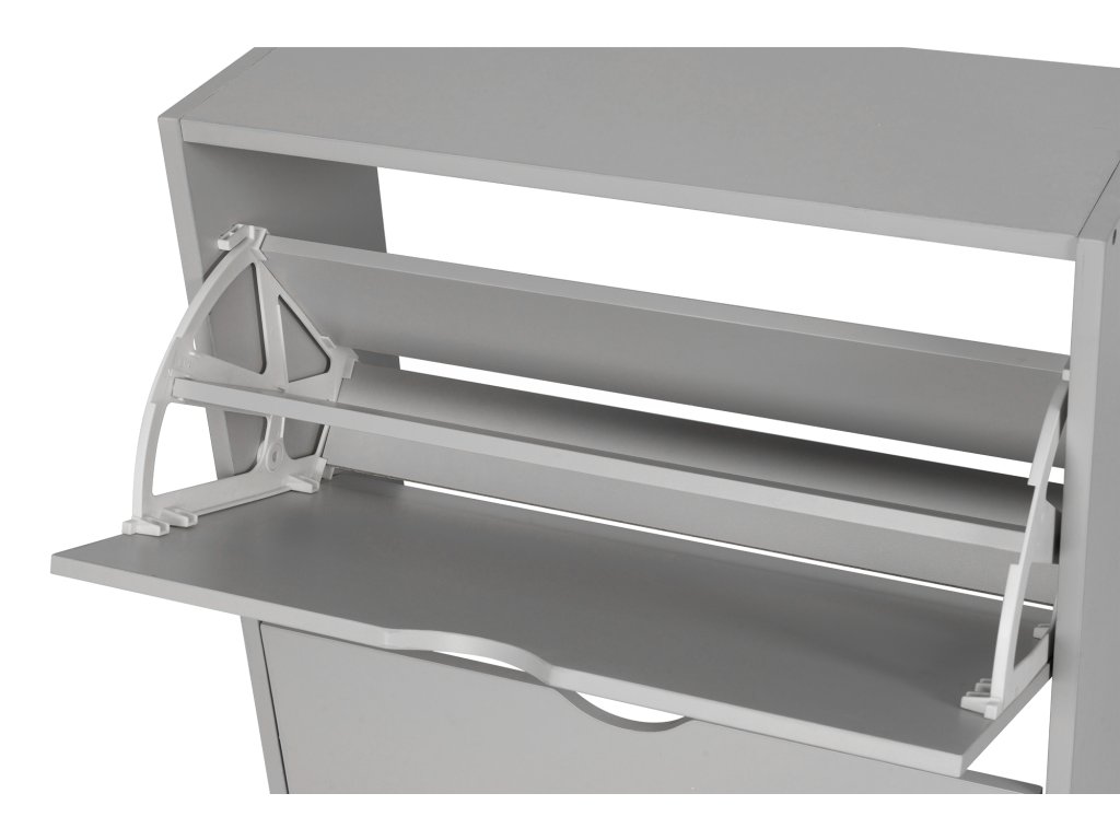 Botník z překližky v šedé barvě, dvě přihrádky, bez zadní desky, 60x24x83 cm.