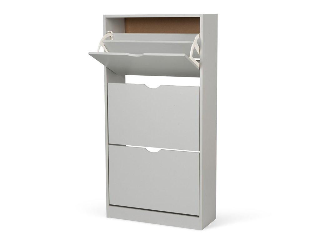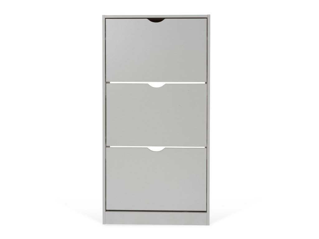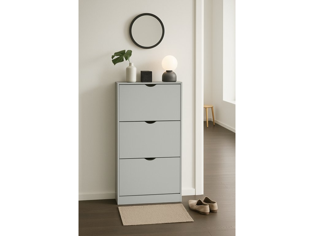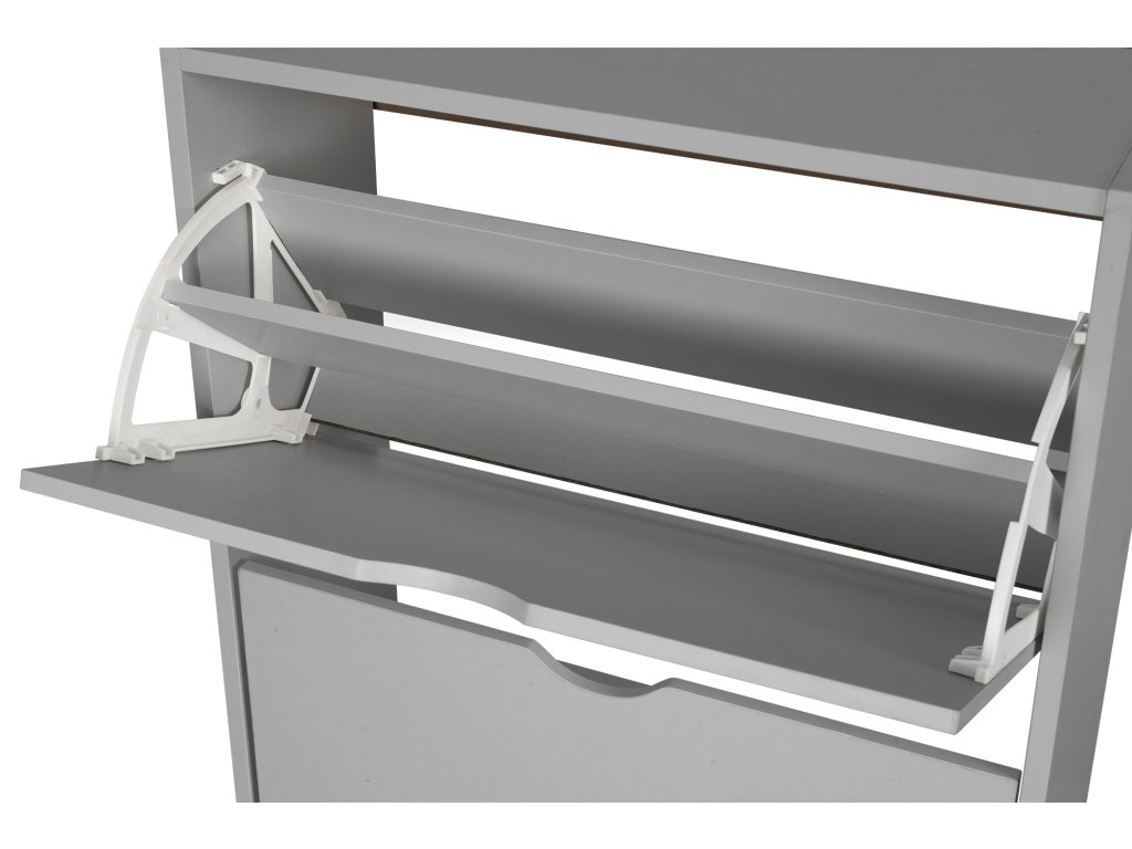 Botník z překližky v šedé barvě, tři přihrádky, bez zadní desky, 60x24x118 cm.