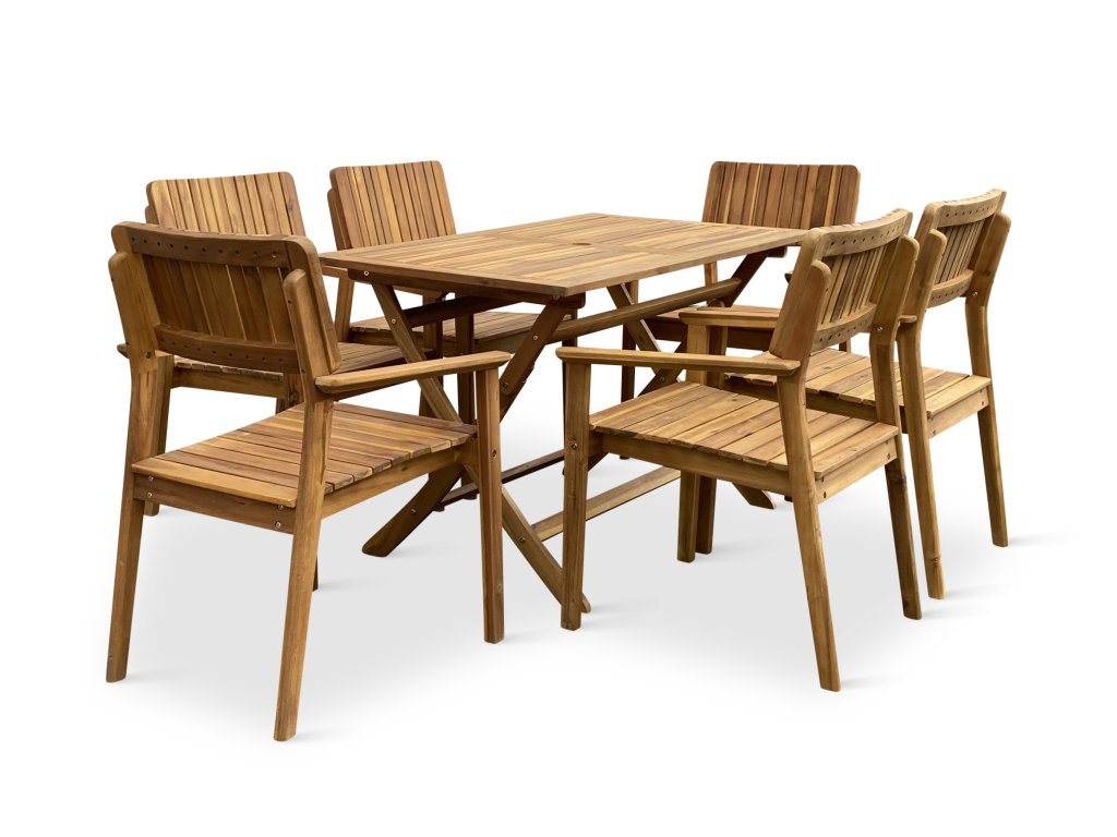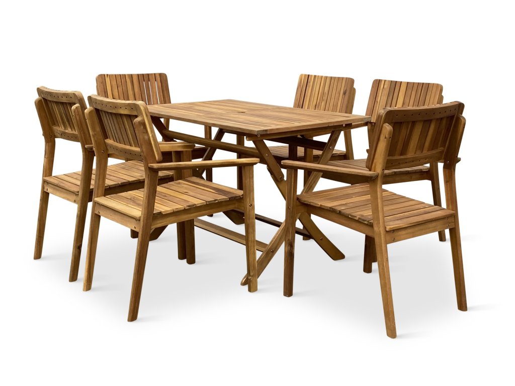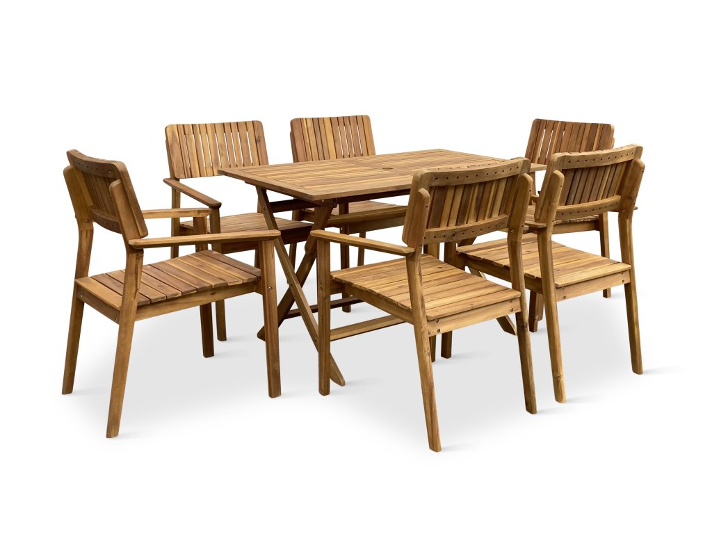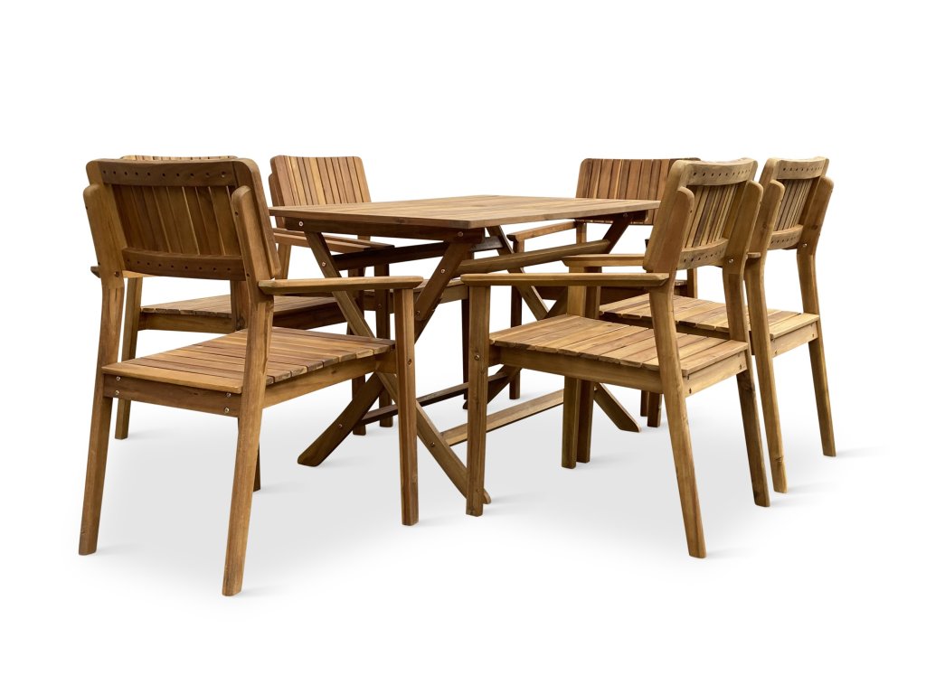 Zahradní jídelní sestavu z akácie tvoří Dřevěný skládací stůl Mandy a 6 Zahradních dřevěných křesel LUCY.