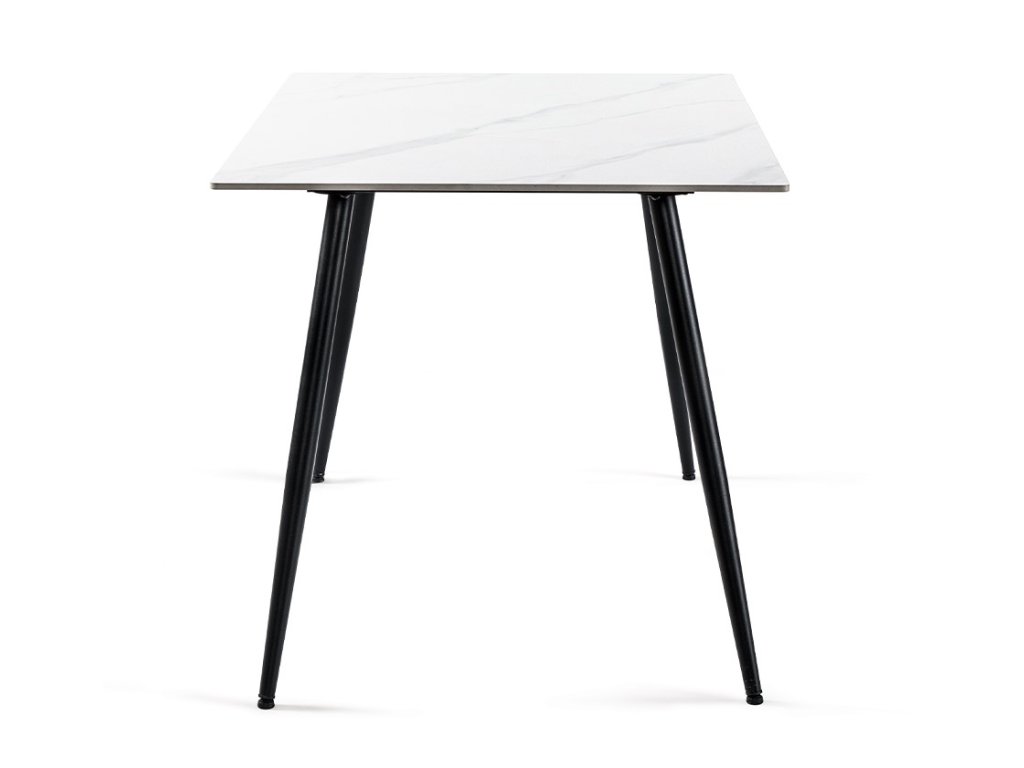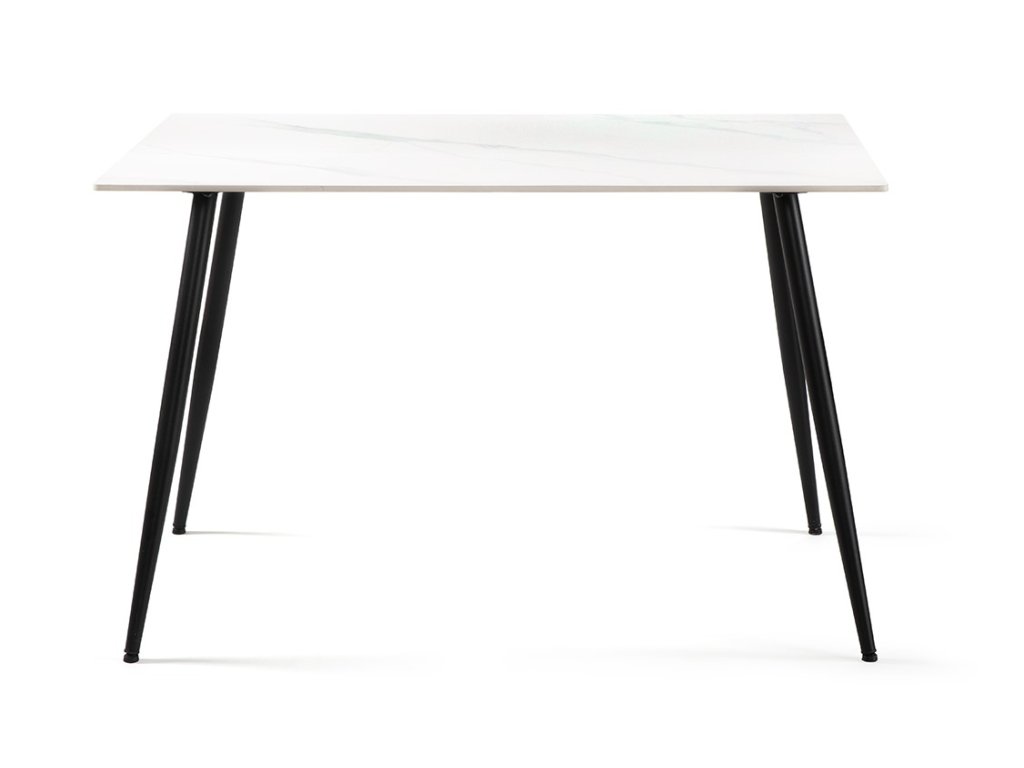 Obdélníkový jídelní stůl o rozměrech 120 x 80 cm přináší moderní minimalistický design. Keramická deska stolu je vyvedena v dekoru mramoru v bílé barvě. Elegantní vzhled stolu umocňují stabilní kovové nohy v černém provedení. Kombinace mramorového dekoru desky v bílé barvě s černými nohami stolu působí luxusně a nadčasově. Použité materiály nevyžadují zvláštní údržbu. Stůl stačí otřít vlhkým hadříkem. Stůl je vhodný do moderní jídelny, kuchyně i menších interiérů.