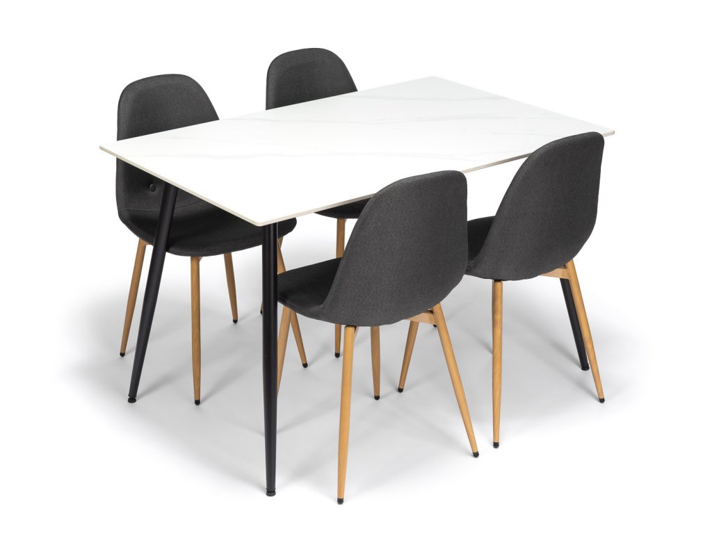 Jídelní sestavu tvoří Jídelní stůl s keramickou deskou v dekoru bílého mramoru CERAMON 120 a 4 Látkové jídelní židle MARIE tmavě šedá.