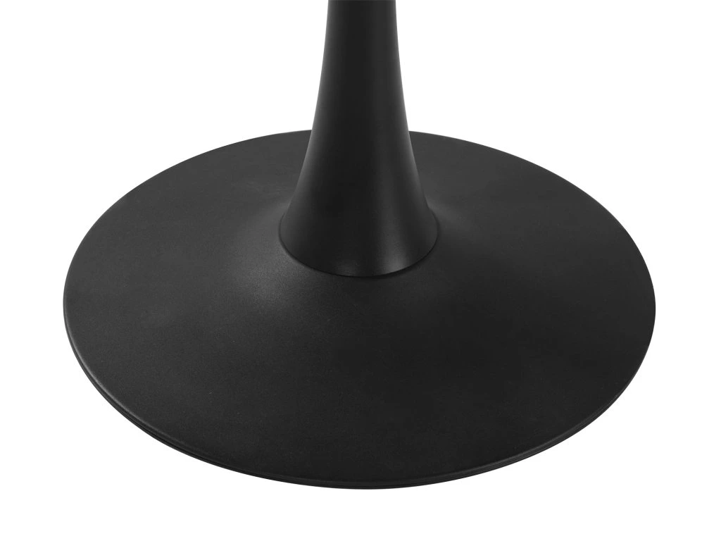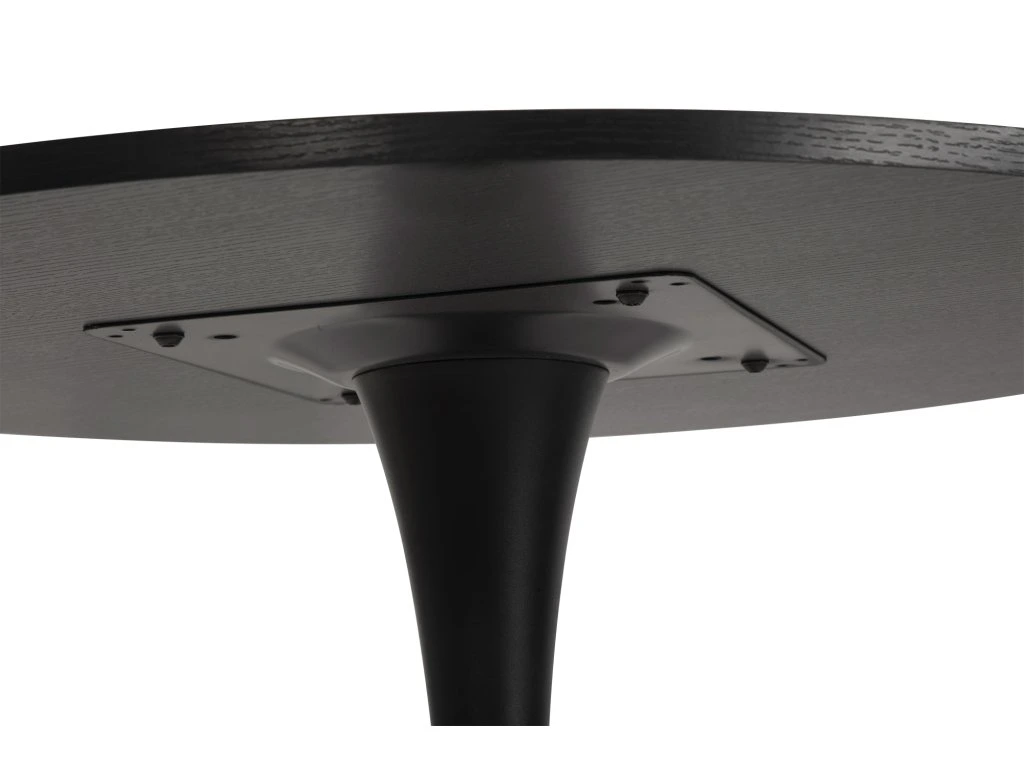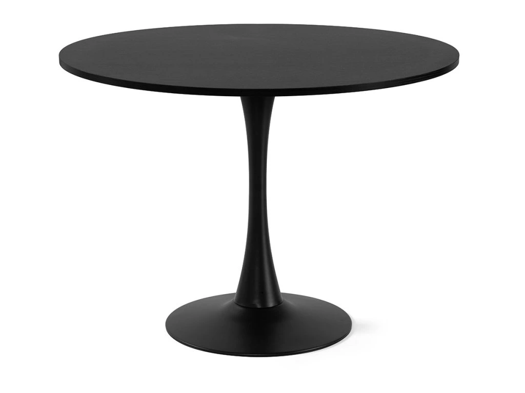 Kulatý jídelní stůl o průměru 100 cm s moderním minimalistickým designem. Deska stolu v černé barvě s texturou dřeva byla vyrobena z dřevovláknité desky MDF. Dodává interiéru elegantní a sofistikovaný vzhled. Jedná se o cenově dostupnější materiál než masivní dřevo. Stabilní noha z pevné oceli zajišťuje pohodlné sezení kolem stolu. Ke stolu umístíte pohodlně 4 židle. Poměrně nízká hmotnost usnadňuje přenášení a manipulaci. Použité materiály nevyžadují zvláštní údržbu. Stůl stačí otřít vlhkým hadříkem.