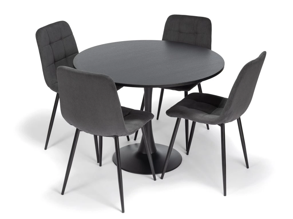 Jídelní sestavu tvoří Kulatý jídelní stůl v dekoru černého dřeva ORBIS 100 a 4 Manšestrová jídelní židle ARIA šedá.