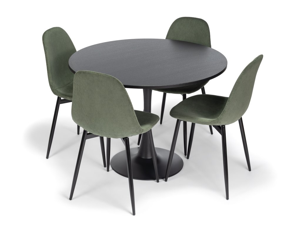 Jídelní sestavu tvoří Kulatý jídelní stůl v dekoru černého dřeva ORBIS 100 a 4 Manšestrové jídelní židle MARIE zelená.