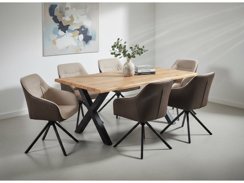 Jídelní sestavu tvoří Jídelní stůl v přírodním dekoru ROBUL 160 a 6x Otočná jídelní židle látková LOREN hnědá/krémová.