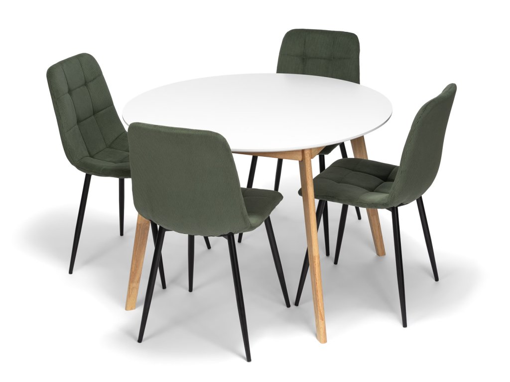 Jídelní sestavu tvoří Kulatý skandinávský jídelní stůl SCANDINAVIA 105 bílý a 4 Manšestrové jídelní židle ARIA zelená.