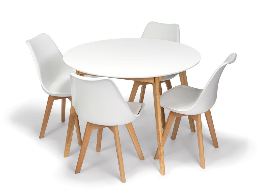 Jídelní sestavu tvoří Kulatý skandinávský jídelní stůl SCANDINAVIA 105 bílý a 4 Skandinávské jídelní židle SCANDINO bílá.