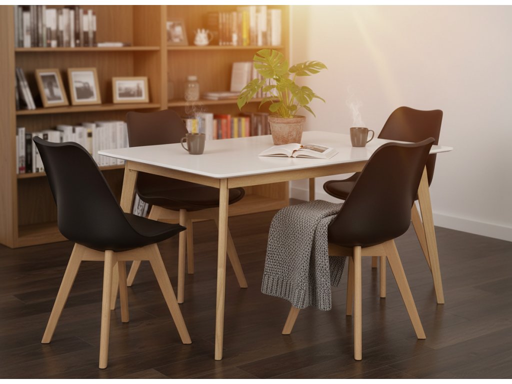 Jídelní sestavu tvoří Skandinávský jídelní stůl SCANDINAVIA 150 bílý a 4 Skandinávské jídelní židle SCANDINO černá.
