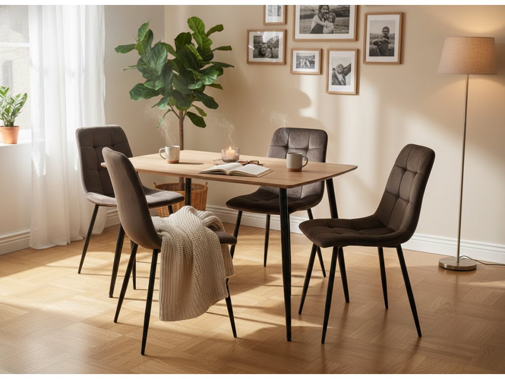 Jídelní sestavu tvoří Jídelní stůl přírodní dekor s černou podnoží VILIS 120 a 4 Sametové jídelní židle ARIA hnědá.
