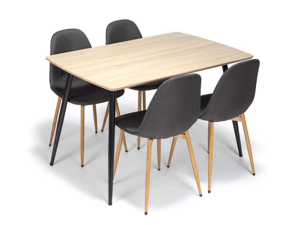 Jídelní sestavu tvoří Jídelní stůl přírodní dekor s černou podnoží VILIS 120 a 4 Látkové jídelní židle MARIE tmavě šedá.