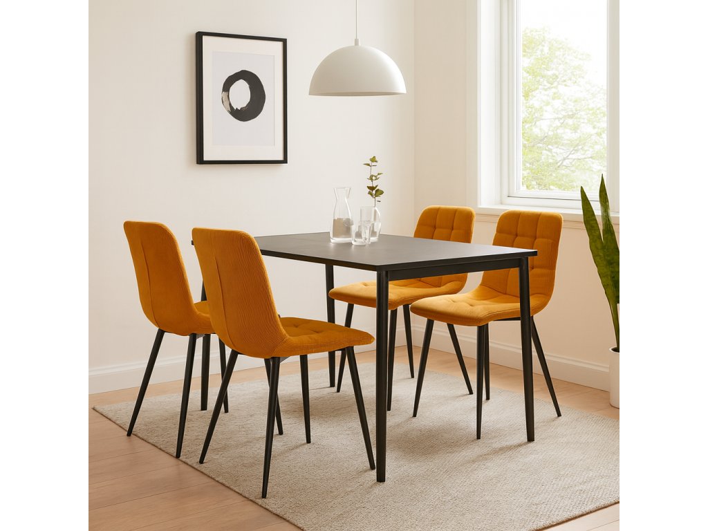 Stylová židle Aria zaujme jednoduchým tvarem a pohodlným čalouněním z manšestru v hořčicové barvě. Kovové nohy v černé barvě dodávají potřebnou stabilitu a snadno se kombinují s různými typy stolů. Sedák je vyrobený z 9 mm překližky a vrstvy pěny 22kg/m s čalouněním z manšestrové látky. Její nosnost činí až 120 kg.