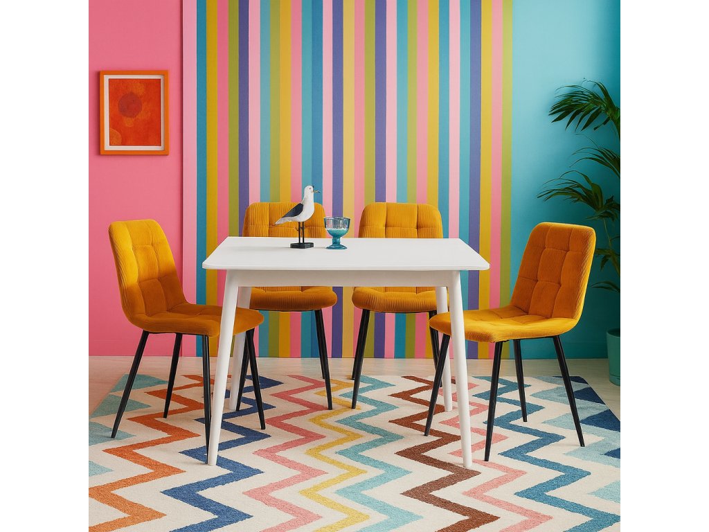 Židle je vhodná do jídelny, obývacího pokoje i pracovny. Spojuje komfort, odolnost a výrazný barevný akcent.