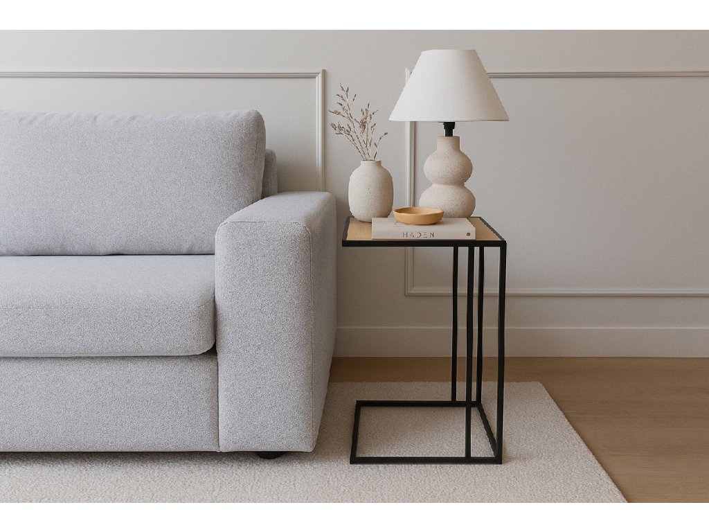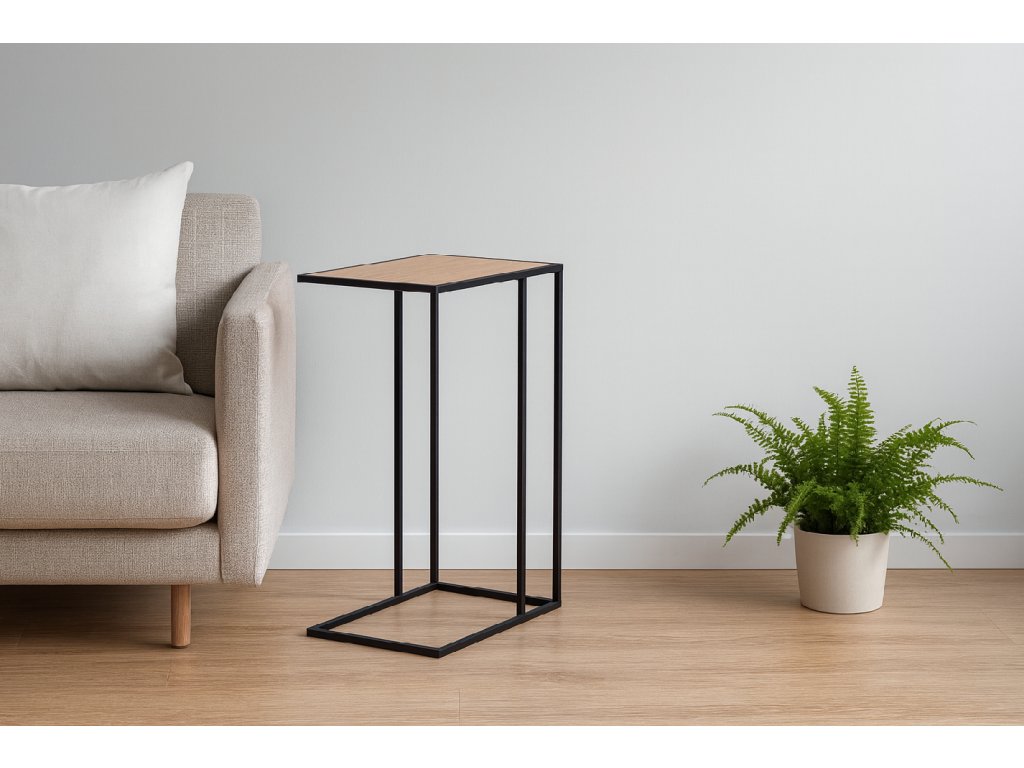 Odkládací stolek, MDF deska v přírodní barvě, ocelové podnoží v černé barvě, 40x30x58 cm.