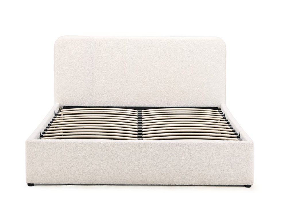 Čalouněná postel s úložným prostorem, překližka s pěnovou výplní a buklé potahem, ocelový rám s hydraulickým zvedáním.