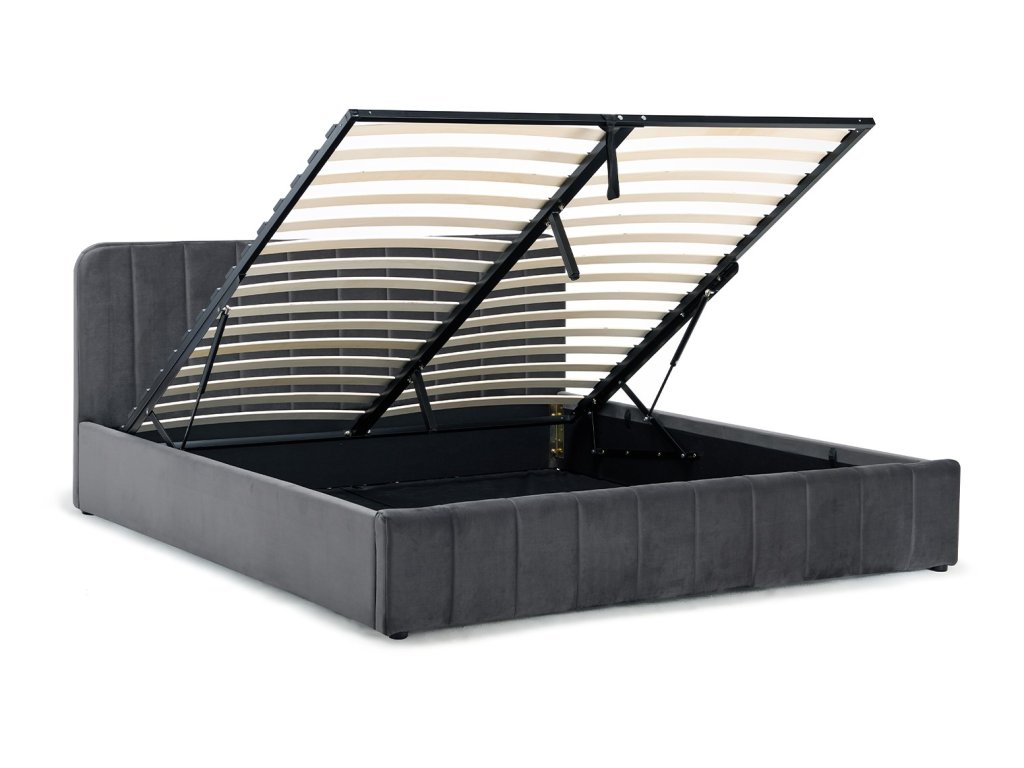 Čalouněná postel s úložným prostorem, překližka s pěnovou výplní a sametovým potahem, ocelový rám s hydraulickým zvedáním.