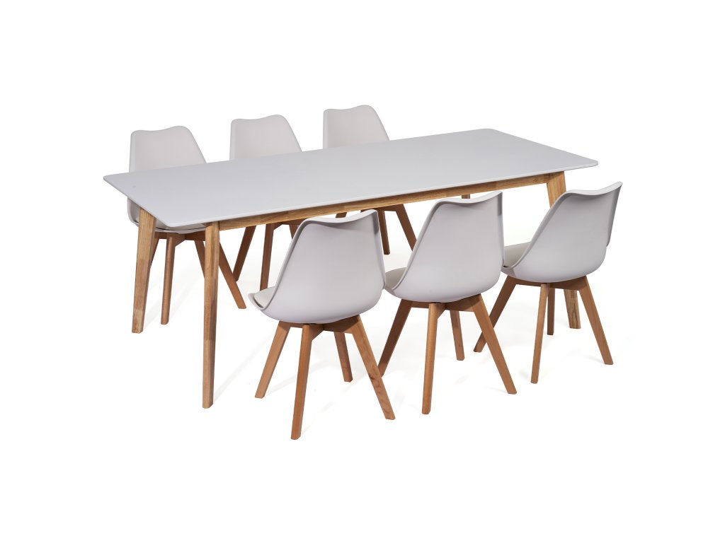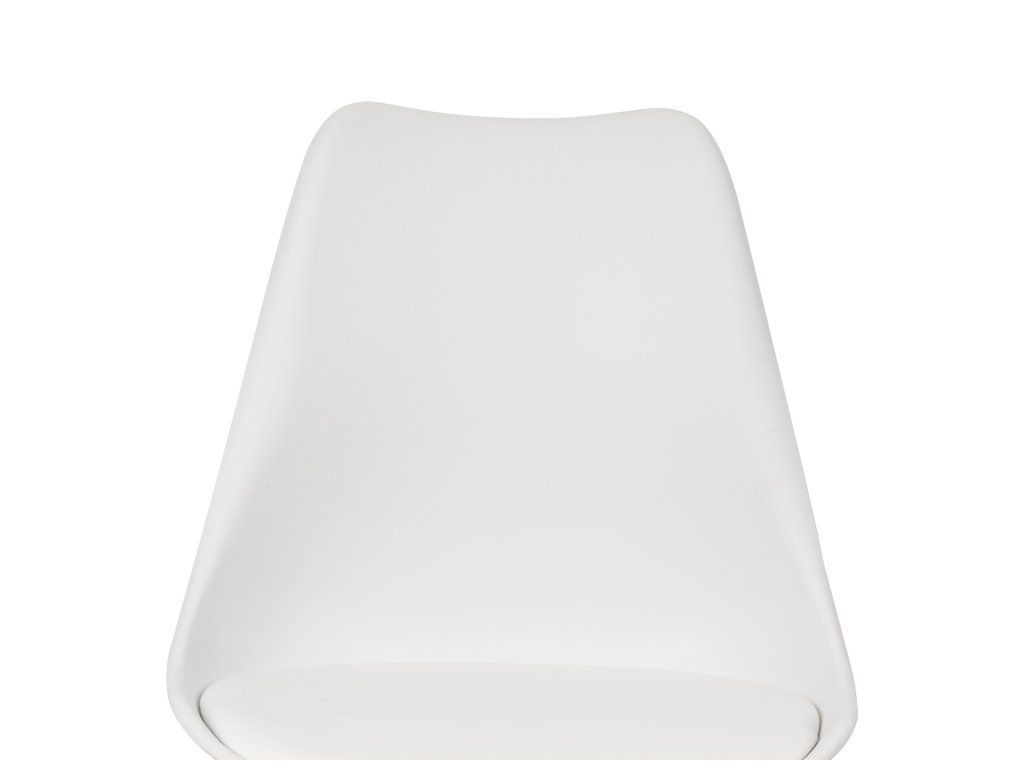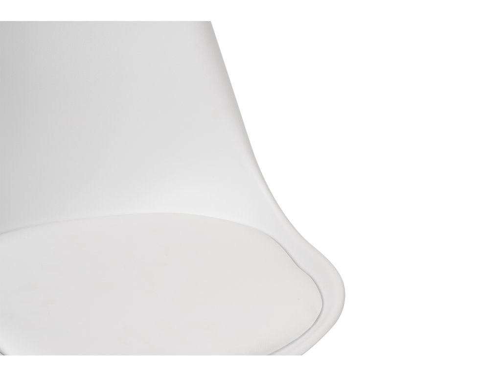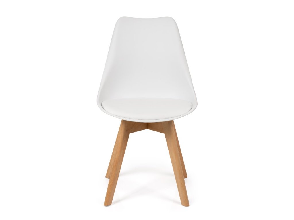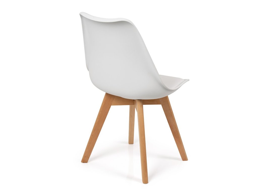 Jídelní židle s dřevěným podnožím v přírodní barvě s bílým sedákem z polypropylenu.