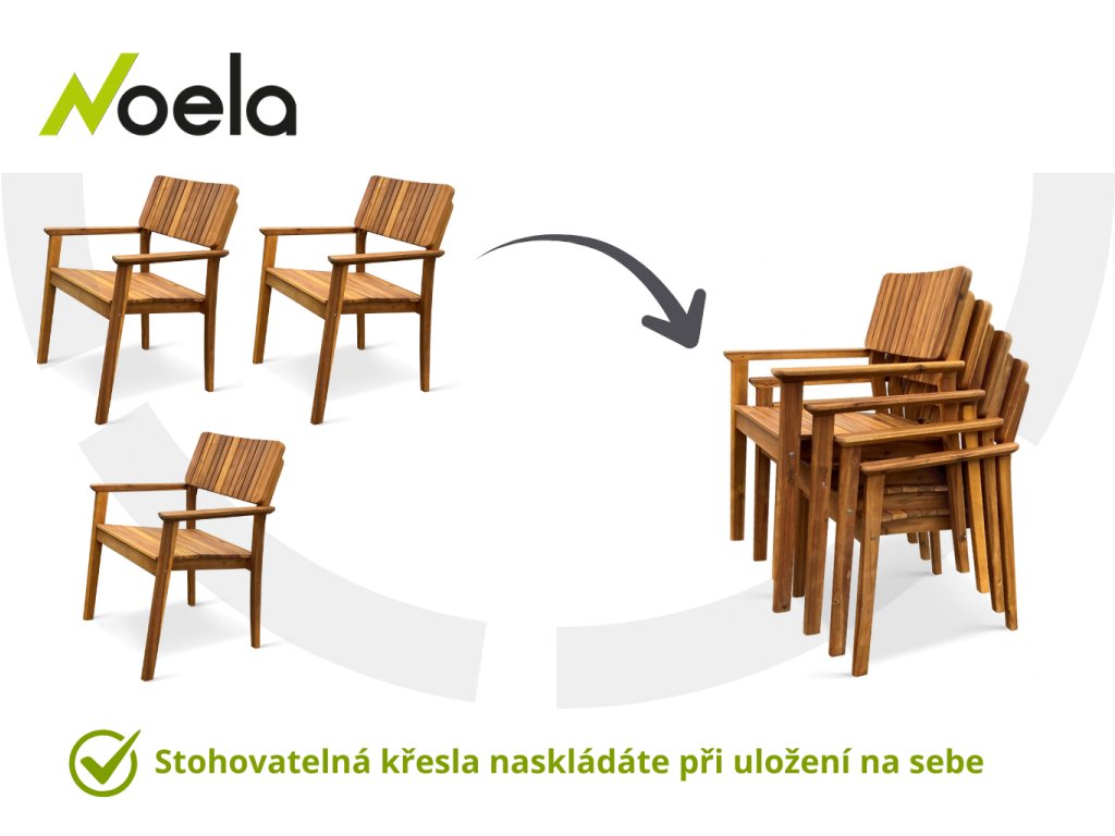Zahradní stůl doplňují 4 křesla LUCY z akáciového dřeva. Zajímavý vzhled a kvalitní zpracování křesla. Zvolená poměrně robustní konstrukce křesla není v kategorii akáciového zahradního nábytku obvyklá. Křeslo je navíc velmi komfortní díky prostornému sedáku o rozměrech 46 x 48 cm a díky pevným dřevěným područkám. Křesla lze stohovat, což oceníte zejména při uskladnění po sezóně. Nosnost činí až 120 kg.