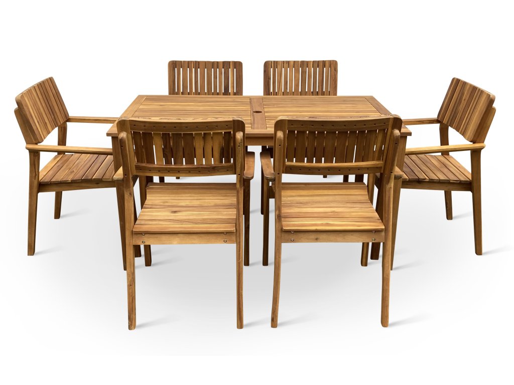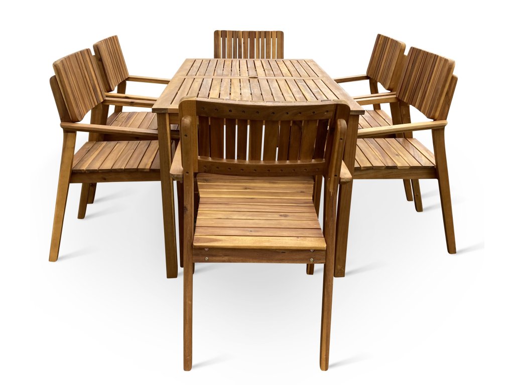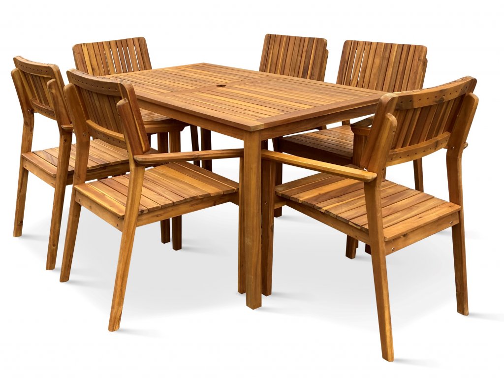 Zahradní jídelní sestavu z akácie tvoří Zahradní dřevěný stůl LUCY a 6 Zahradních dřevěných křesel LUCY.