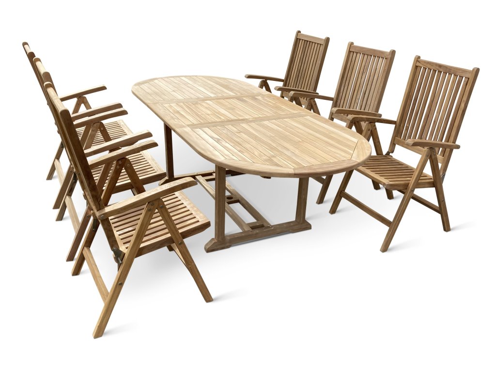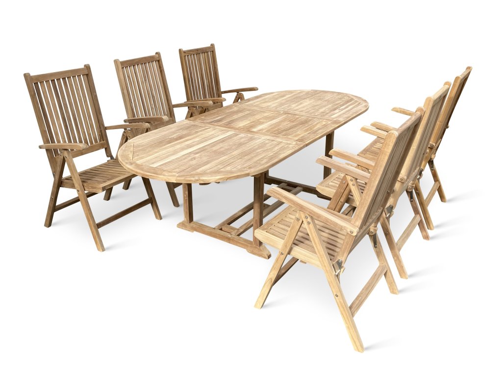 Zahradní rozkládací stůl oválný Faisal a 6 dřevěných skládacích a polohovacích židlí Edy tvoří dohromady opravdu luxusní sestavu nábytku pro Vaši zahradu.