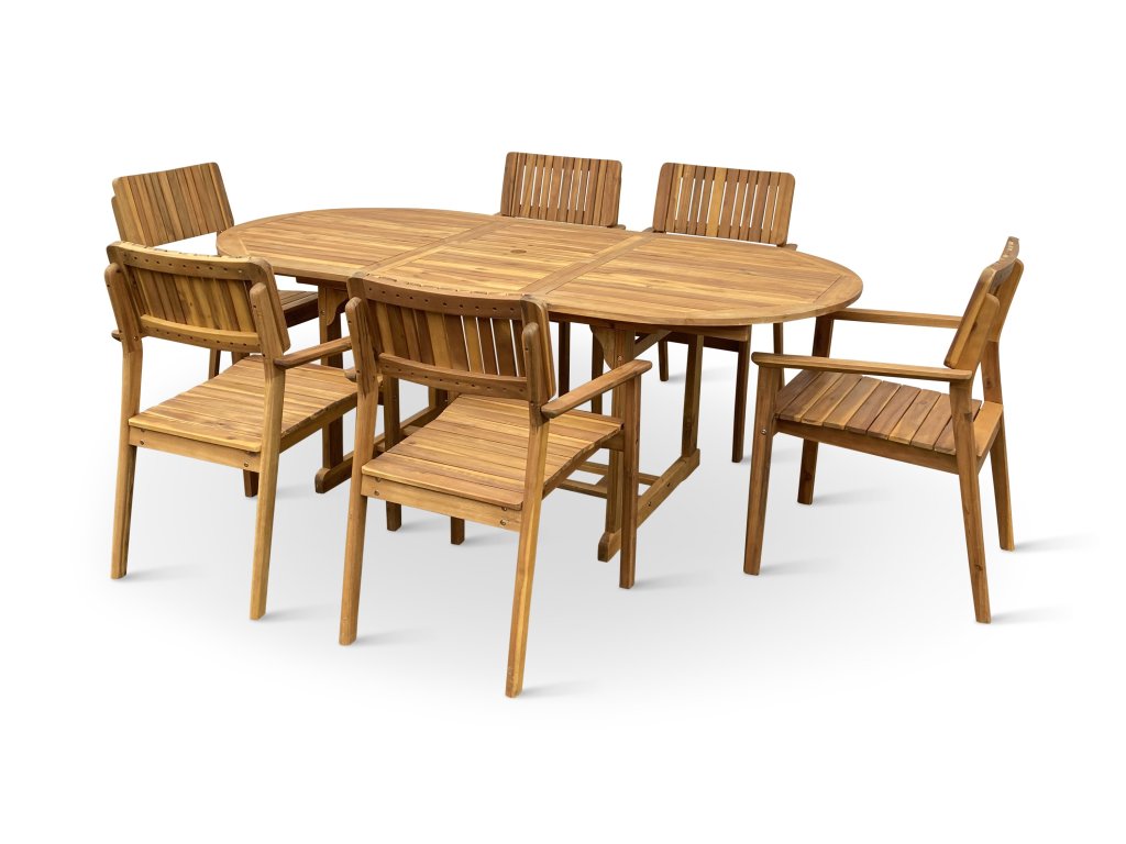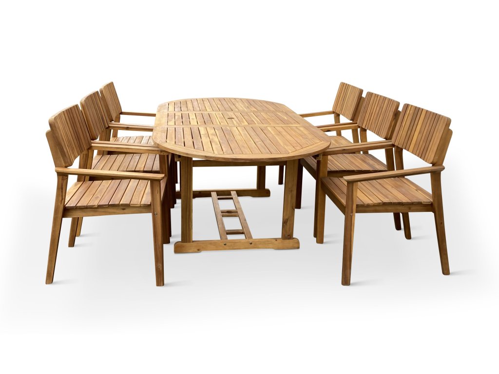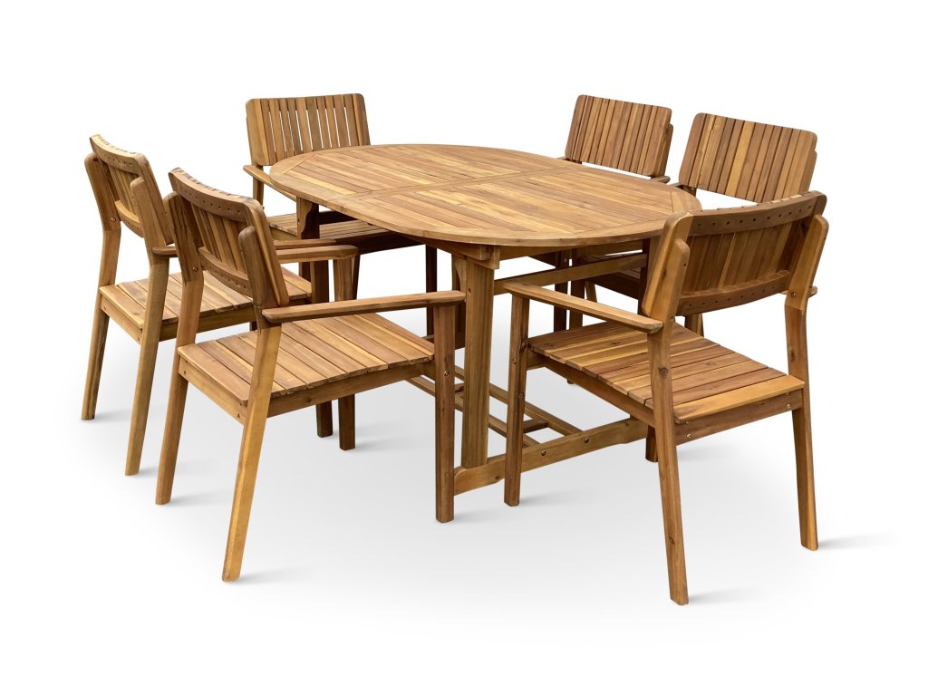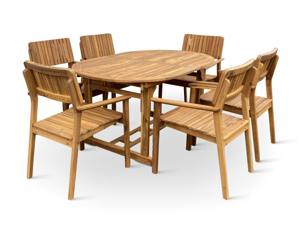 Zahradní jídelní sestavu z akácie tvoří zahradní dřevěný stůl Viet a 6 zahradních dřevěných křesel LUCY.