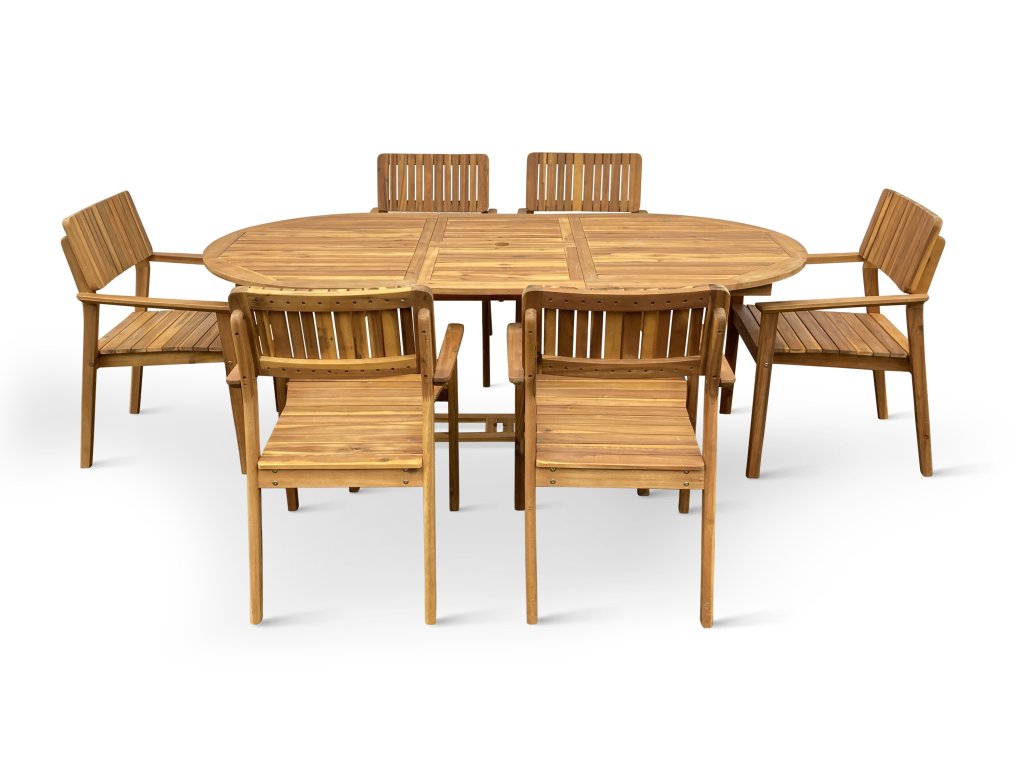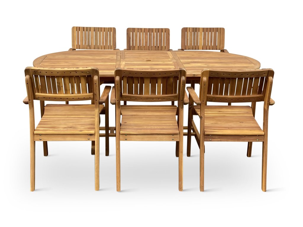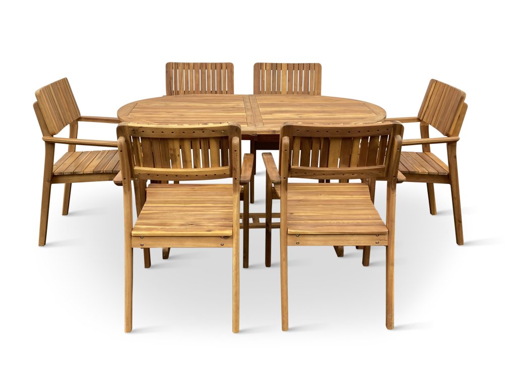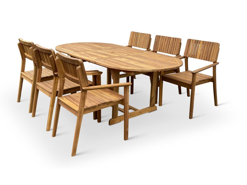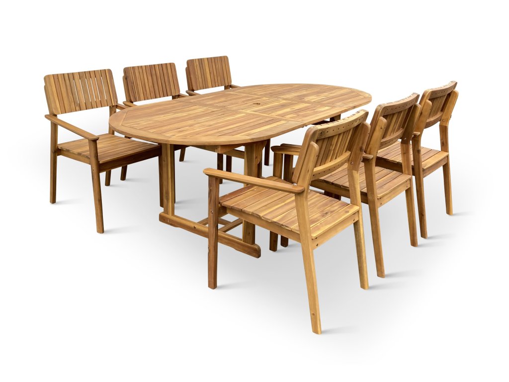 Zahradní jídelní sestavu z akácie tvoří zahradní dřevěný stůl Viet a 6 zahradních dřevěných křesel LUCY.