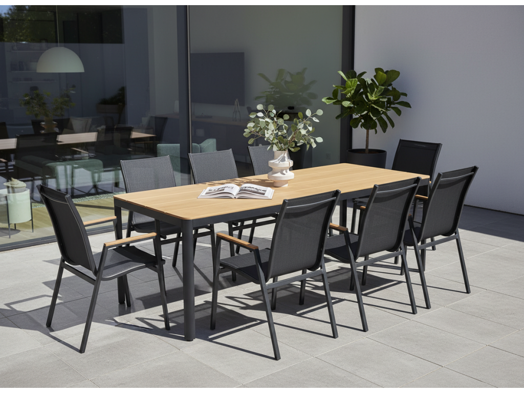 Stůl MILANO je ideálním jídelním stolem vhodným jak do zahrady, tak na terasu. Jeho luxusní, moderní design, který ctí jednoduché a čisté linie, zajistí, že ještě dlouho nevyjde z módy a jen tak Vás neomrzí. Konstrukce stolu vyrobená z hliníku ošetřeného proti rzi zaručuje dostatečnou stabilitu a nosnost. Designová deska v hnědé barvě je vyrobena z umělého dřeva artwood. Umělé dřevo oproti tomu přírodnímu skýtá celou řadu výhod. Artwood odolává povětrnostním vlivům a oproti dřevu přírodnímu vyžaduje pouze minimální údržbu. Nastavitelné adaptéry u nohou pro větší stabilitu.