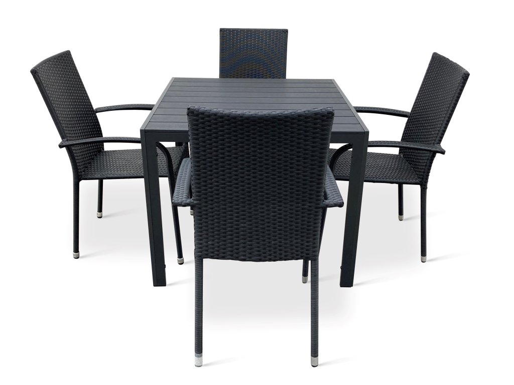 Sestavu tvoří Bezúdržbový kovový stůl Viking M a 4 Zahradní ratanové židle Paris KD.
