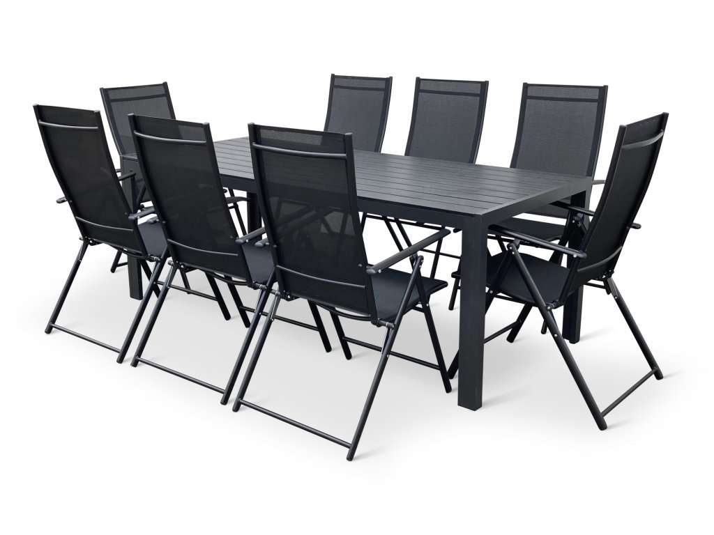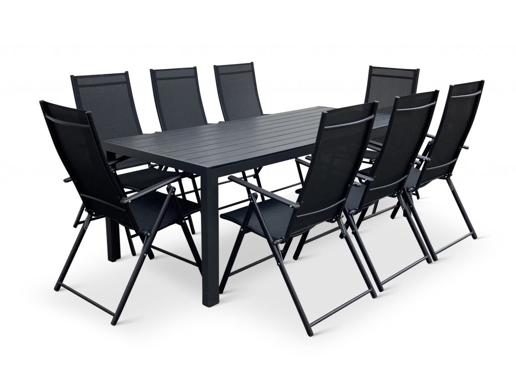 Sestavu tvoří Bezúdržbový kovový stůl Viking XL a 8 Polohovacích kovových židlí Pia.