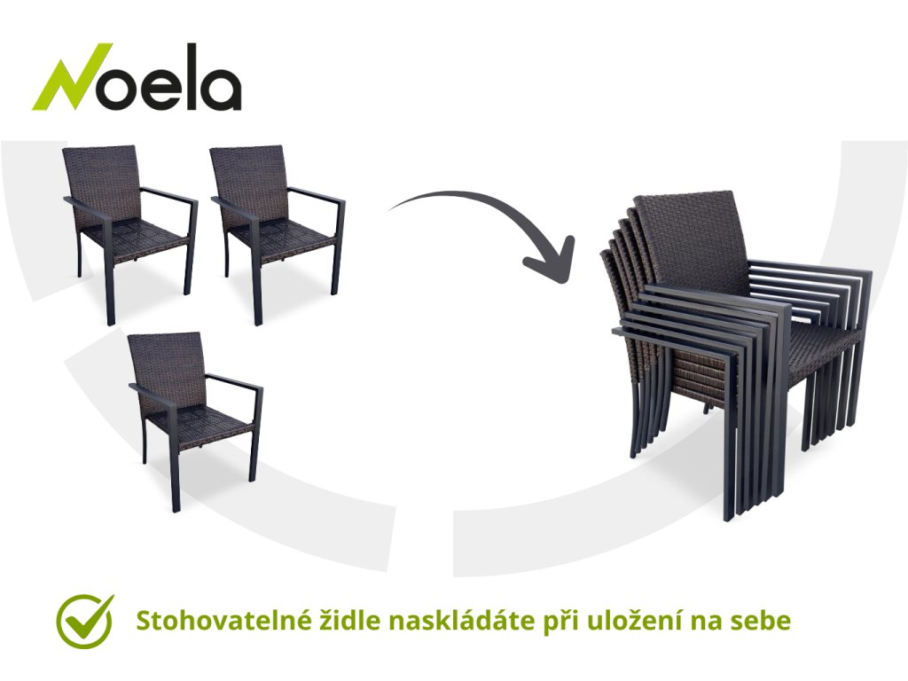 Pohodlná a prostorná zahradní židle s ocelovou konstrukcí, která se hodí prakticky kamkoliv. Židle je stohovatelná, téměř bezúdržbová a má vyztužený sedák, který unese těžší váhy i po delší dobu. Kombinace sedáku a opěrky z umělého ratanu v tmavě hnědé barvě a černých hranatých područek z kovu tvoří dohromady moderní a praktickou zahradní židli. Židle disponuje největším sedákem v kategorii zahradních židlí z umělého ratanu s velkorysými rozměry 49 x 48 cm. Hloubka sedáku je 49 cm a šířka mezi područkami 48 cm. Kovové části konstrukce byly ošetřeny proti rzi. Nosnost činí až 130 kg!