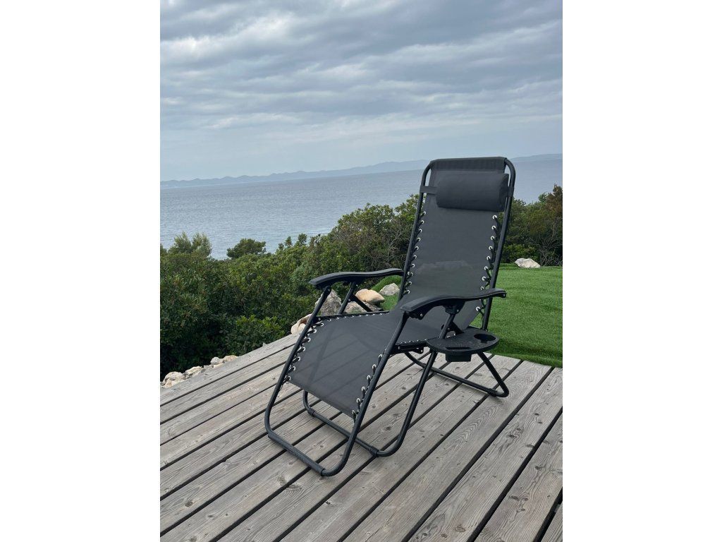 Vysoce kvalitní polohovací sedačka s černou kovovou konstrukcí, která vyniká svou stabilitou a stálostí. Její ocelová konstrukce je povrchově ošetřena proti rzi. Sedák relaxačního křesla je vyroben z šedého textilenu, který je lehký, odolný a téměř bezúdržbový. Pro lepší komfort sezení sedačka disponuje opěrkami pro ruce. Díky nízké hmotnosti 6,5 kg relaxační křeslo snadno přenesete. Dodáváno včetně malého stolku s držákem na hrnek a mobil, který je upevněn na boku konstrukce. Nosnost činí až 130 kg.