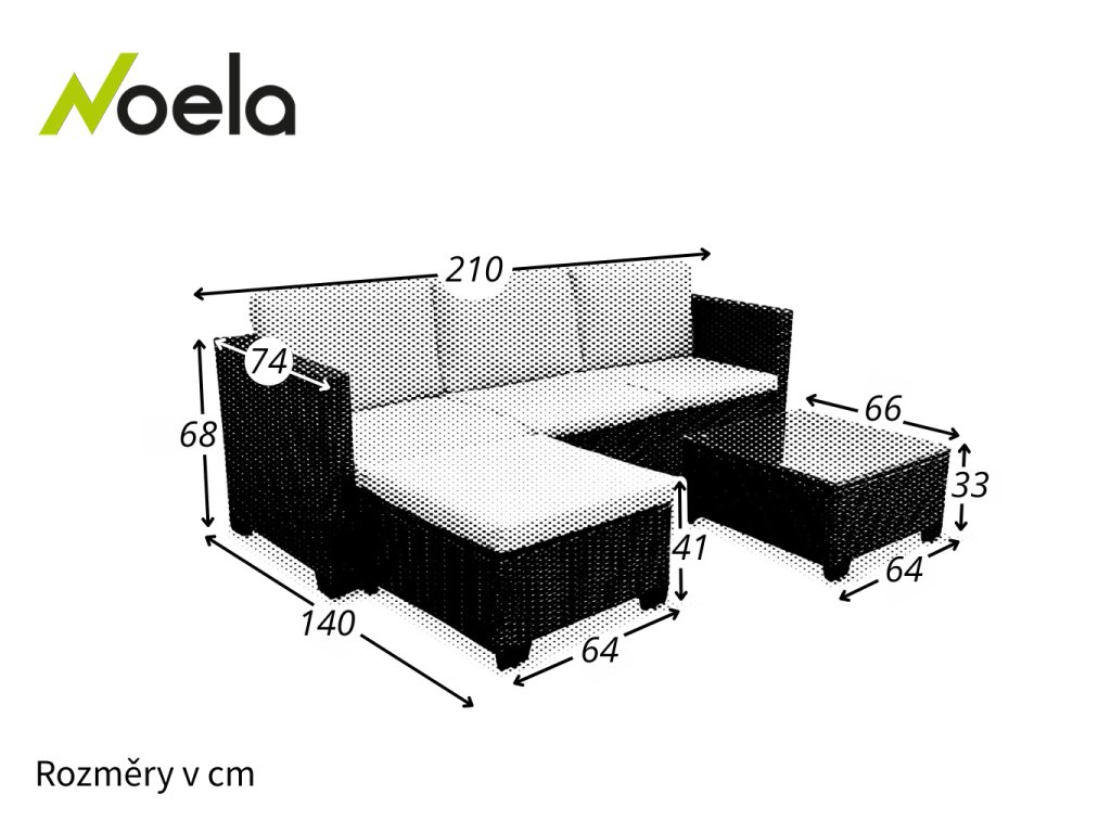Rozměry pohovky: 74 cm x 210 cm x 68 cm (Hloubka x Šířka x Výška)