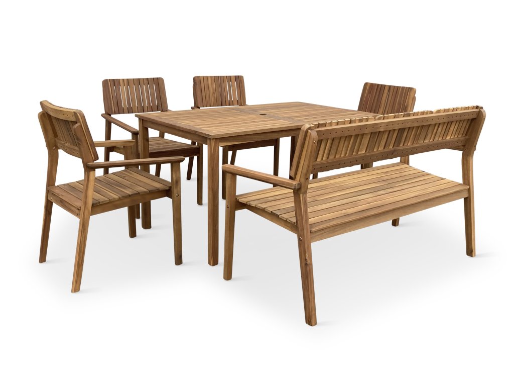 Zahradní jídelní sestavu z akácie tvoří Zahradní dřevěný stůl LUCY, Zahradní dřevěná lavička LUCY pro 3 osoby a 4 Zahradní dřevěná křesla LUCY.