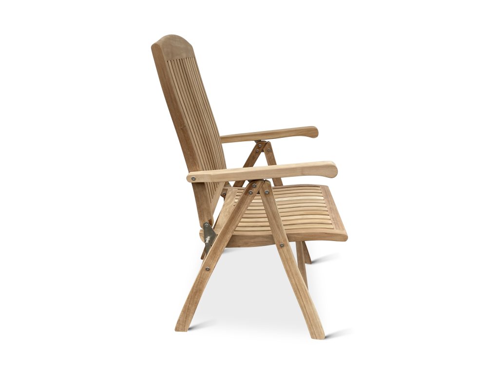 Zahradní stůl doplňují 4 polohovací dřevěné židle z vysoce odolného materiálu teak. Židle je anatomicky tvarovaná. Široké područky pro pohodlné sezení a rychlá možnost složení pro potřebu uložení. Vysokou zádovou opěrku zahradní židle America si můžete podle potřeby nastavit až do 7 poloh. Nosnost činí až 130 kg.